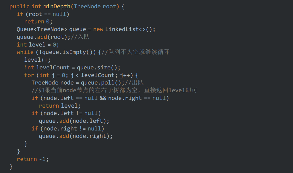 我们还可以使用递归的方式,返回Math.min(左子树的深度,右子树的深度)+1,看起来很有道理,但有一个问题,如果左右子树都不为空或者都为空定汶回题的。但如果左右子树一个为空一个不为空,就会有问题了,因为为空的那个子节点的深